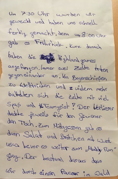 Um 7:30 Uhr wurden wir geweckt und haben uns schnell fertig gemacht, denn um 8:00 Uhr gab es Frühstück. Kurz danach haben die Highlandgames angefangen. Immer zwei Zelte trafen gegeneinander an. Von Bogenschießen zu Wetttrinken und zu vielem mehr battelten sich die Zelte mit viel Spaß und Teamgeist! der Verlierer deckte jeweils für den Gewinner den Tisch. Zum Mittagessen gab es dann Salat und Brötchen mit Wurst usw. bevor es weiter zum "Muddy Run" ging. Der bestand daraus dass wir durch einen Parcour im Wald rennen mussten, und der hatte es in sich!EndeZelt 16