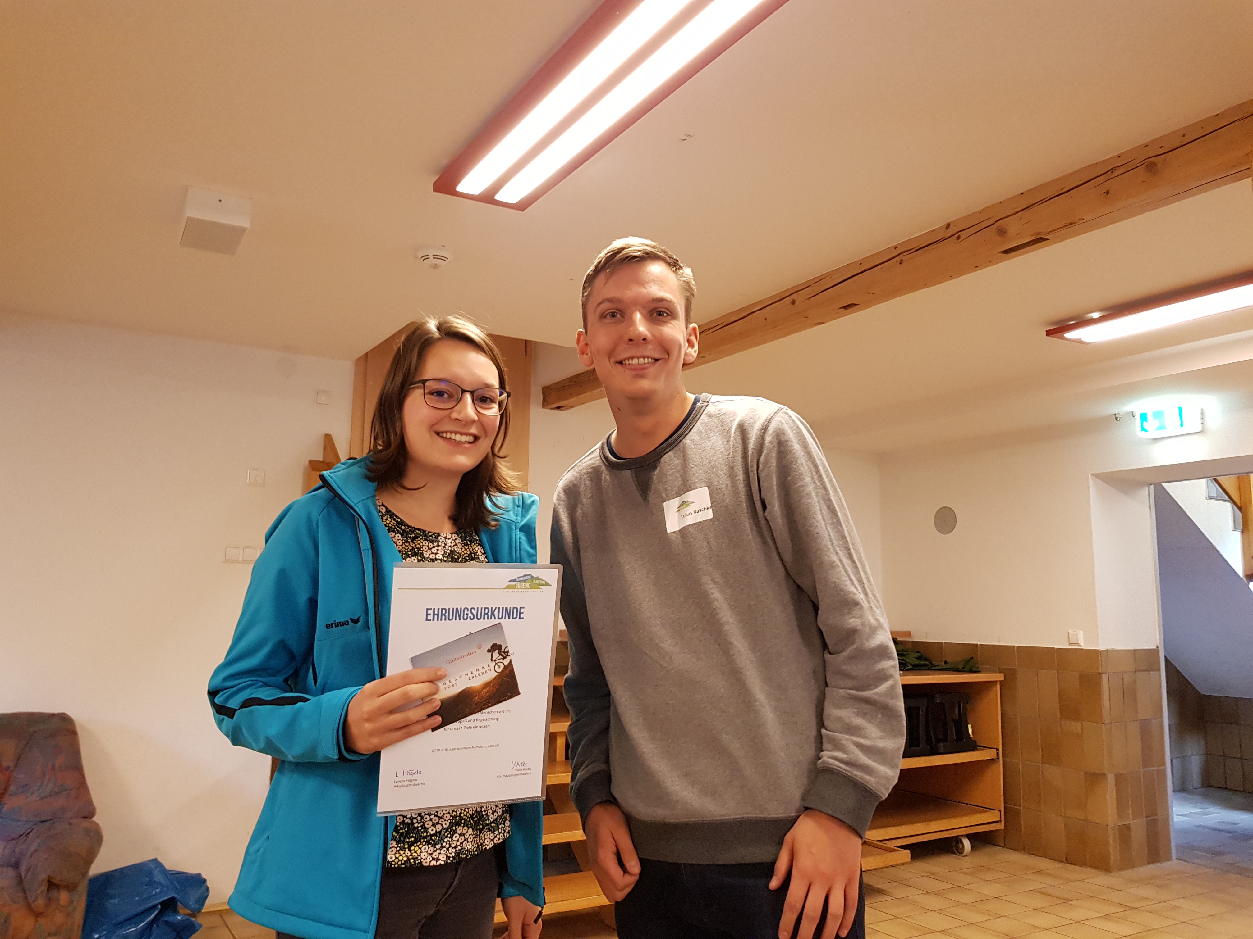 Am Sonntagmorgen stand nach dem Frühstück und einer ersten Putz-Action die Herbst-JVV auf dem Programm. Zu Beginn begrüßte Hauptjugendwartin Lorena Hägele alle Teilnehmenden und stellte die Anzahl der 25 Stimmberechtigten fest. Nach dieser Formalität verlas ihre Stellvertreterin Viola Krebs die Berichte der Fachwarte. Es konnten im Anschluss Matthias Schäfer (DWJ) und Monika Hämmerle (Landesjugendring) durch die Versammlung bestätigt werden. In der Folge stellten alle Freizeitleiter unter der Moderation von Daniel Gabel die Freizeiten, Fortbildungen und sonstigen Veranstaltungen des abgelaufenen Jahres vor. Darauf aufbauend führte Freizeiten-JB Kevin Mendl durch die eingereichten Informationen zu den Veranstaltungen im neuen Jahr. Anschließend kamen die Stimmberechtigten erneut zum Einsatz und bestätigten alle vorgeschlagenen Freizeit- bzw. Lehrgangsleiter. Seid gespannt, was euch nächstes Jahr so Neues und auch Altbekanntes erwartet ?. Als TOP 7 stellte Adina noch die neuesten Arbeiten des Jugendbeirats vor. So gibt es seit dem Beginn der Freizeiten eine Instagram-Seite der Schwäbischen Albvereinsjugend, welche auch erfreulicherweise eine tolle Resonanz findet. Außerdem wurden im Rahmen des Albvereinsaktionstags zahlreiche Veranstaltungen der verschiedenen Ortsgruppe und Gaue besucht. Nachdem Jakob Schnell feststellte, dass keine Anträge gestellt wurden, konnte Adrian Herbst die Vertretersammlung mit dem Punkt Verschiedenes abschließen. Hier galt es Danke zu sagen: Zunächst Daniel Sanwald und seinem eifrigen Helfer-Team für die Konstruktion der Fundamente für das neue Tischtenniszelt. Anschließend ließ es sich die Hauptjugendwartin nicht nehmen selbst die Ehrung ihres Stellvertreters Lukas Raschke vorzunehmen. Dieser wurde auf Grund zahlreicher Verdienste und jahrelangem, herausragenden Engagement in den Diensten der Schwäbischen Albvereinsjugend mit der 2. Ehrungsstufe ausgezeichnet. Die Sitzung konnte anschließend offiziell beendet werden, nachdem geklärt war, wie viele Vegetarier beim anschließenden Mittagessen noch zugegen sein werden. Nachdem der erste Hunger mit Hilfe von LKW's bekämpft war, wurden die Aufräumarbeiten fortgesetzt und alle konnten nach einem ereignisreichen Wochenende gegen Nachmittag das Gelände wieder gemeinsam verlassen. Wir freuen uns schon auf die Frühjahrs-JVV am 24. März in der "Weltstadt" Oberboihingen.